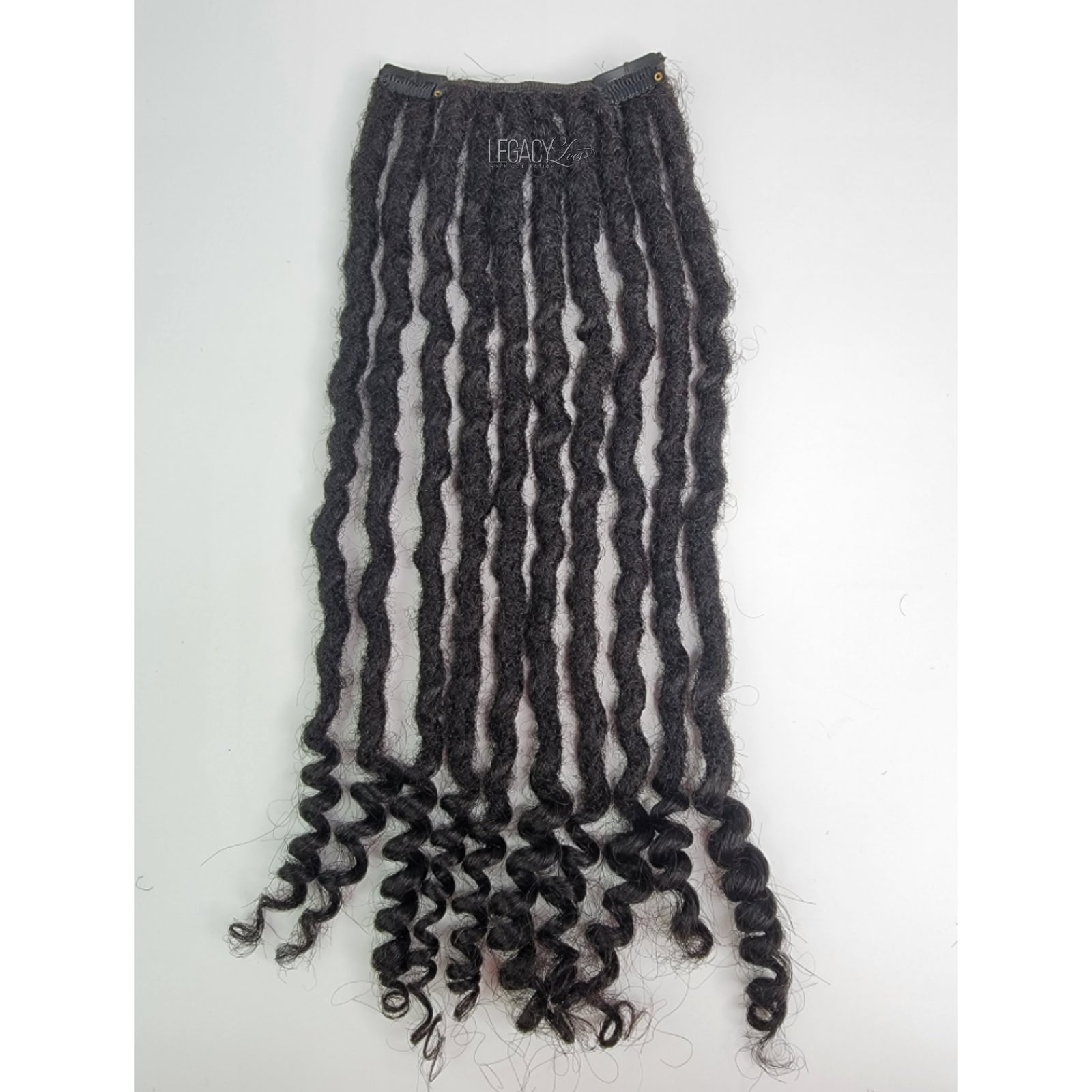 Legacy Clip-in Loc Extensions are handmade using 100% afro kinky human hair. Each clip in has 10 locs crochet onto a weft. Legacy Clip-in Loc Extensions are soft, lightweight, and blends perfectly if you're trying to achieve extra volume to your current locs.